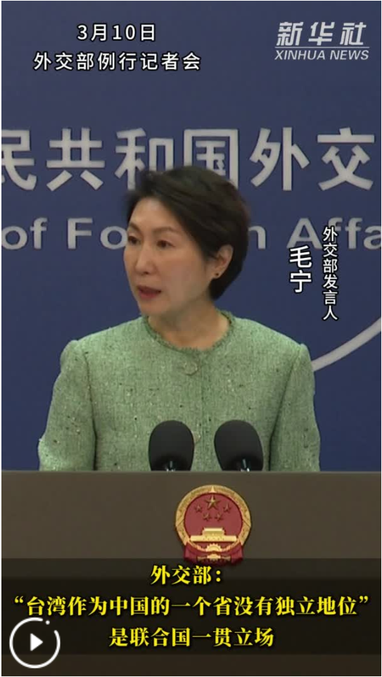 新华社北京3月10日电(记者温馨、董雪)外交部发言人毛宁10日表示,联合国及其专门机构在提及台湾时,使用的称谓就是“中国台湾省”。“台湾作为中国的一个省没有独立地位”,这是联合国的一贯立场,均有案可查。