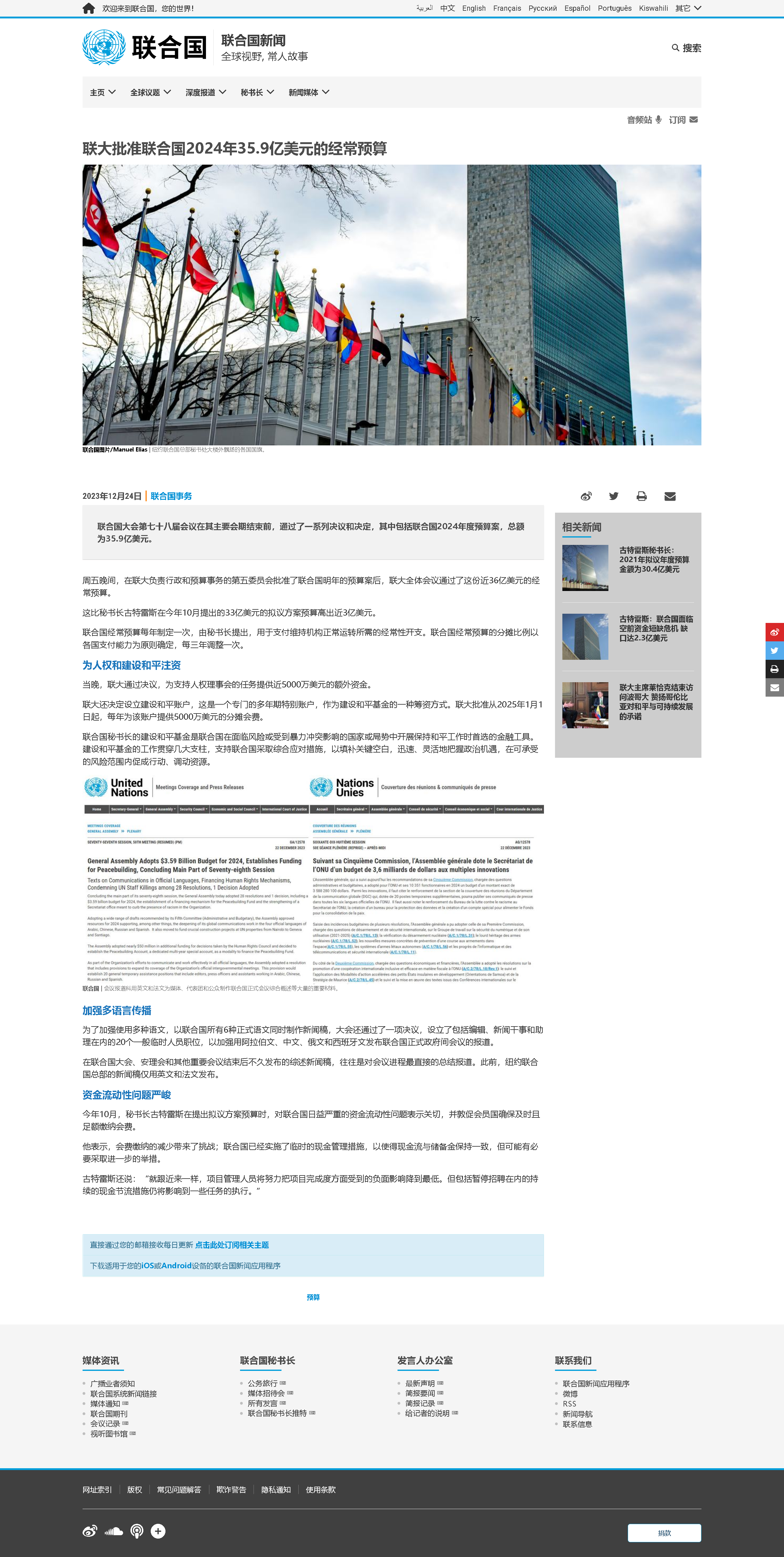 新华社联合国12月24日电(记者尚绪谦)联合国新闻网站24日消息,第78届联合国大会已批准总额约为35.9亿美元的2024年度联合国常规预算,略高于2023年度预算。