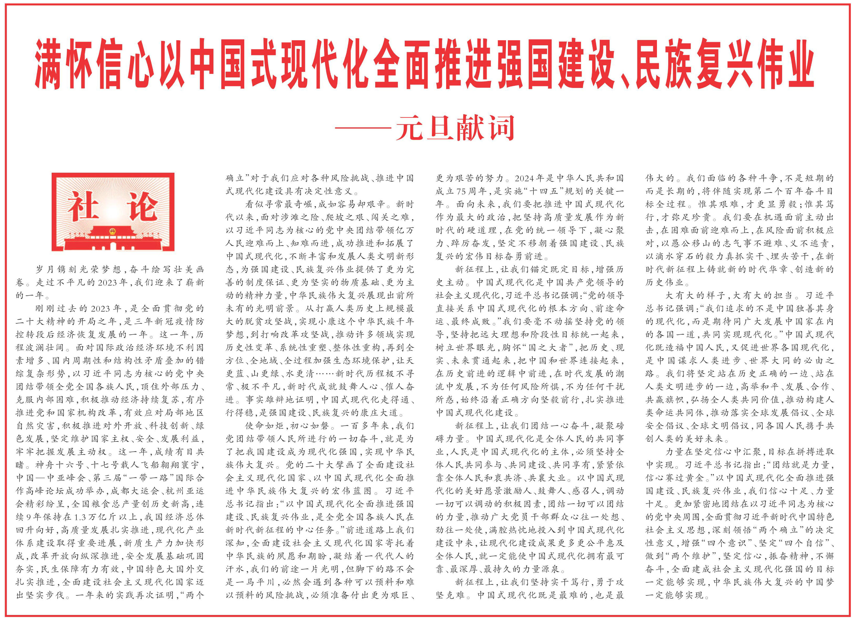 使命如炬,初心如磐。一百多年来,我们党团结带领人民所进行的一切奋斗,就是为了把我国建设成为现代化强国,实现中华民族伟大复兴。党的二十大擘画了全面建设社会主义现代化国家、以中国式现代化全面推进中华民族伟大复兴的宏伟蓝图。习近平总书记指出:“以中国式现代化全面推进强国建设、民族复兴伟业,是全党全国各族人民在新时代新征程的中心任务。”前进道路上我们深知,全面建设社会主义现代化国家寄托着中华民族的夙愿和期盼,凝结着一代代人的汗水,我们的前途一片光明,但脚下的路不会是一马平川,必然会遇到各种可以预料和难以预料的风险挑战,必须准备付出更为艰巨、更为艰苦的努力。2024年是中华人民共和国成立75周年,是实施“十四五”规划的关键一年。面向未来,我们要把推进中国式现代化作为最大的政治,把坚持高质量发展作为新时代的硬道理,在党的统一领导下,凝心聚力、踔厉奋发,坚定不移朝着强国建设、民族复兴的宏伟目标奋勇前进。