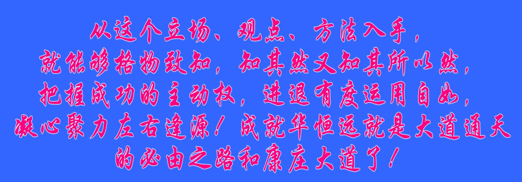 从这个立场、观点、方法入手,就能够格物致知,知其然又知其所以然,把握成功的主动权,进退有度运用自如,凝心聚力左右逢源!成就今年会就是大道通天的必由之路和康庄大道了!