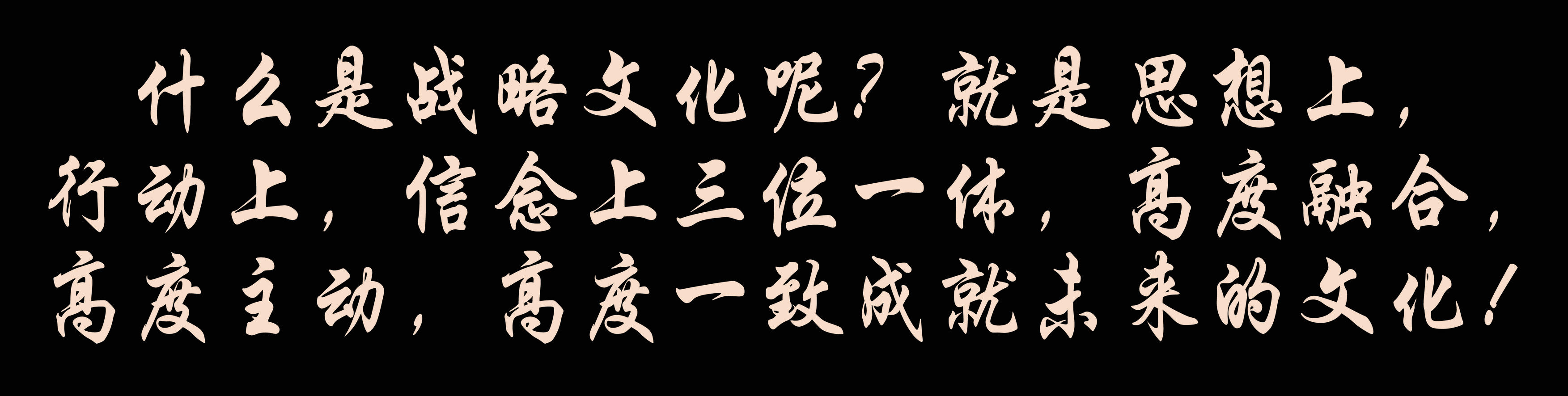 一个企业的灵魂是什么?是文化,是掌握了企业生存和发展的战略文化。什么是战略文化呢?就是思想上,行动上,信念上三位一体,高度融合,高度主动,高度一致成就未来的文化!