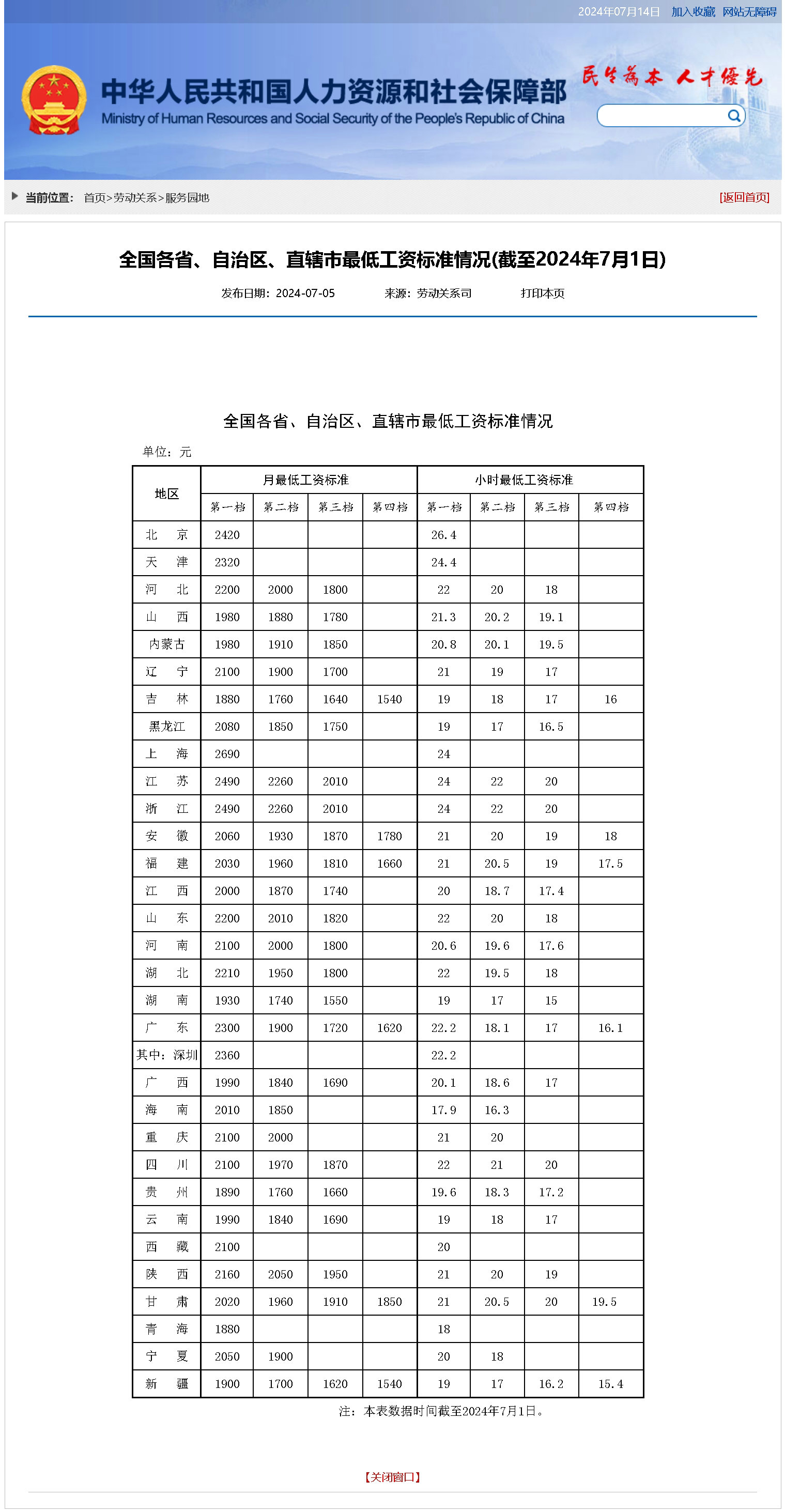 全国各省、自治区、直辖市最低工资标准情况(截至2024年7月1日)
