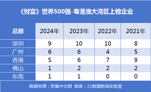 据21数据新闻实验室统计,粤港澳大湾区共有22家公司入围世界500强,2023年营收总额约为1.39万亿美元,利润总额为919亿美元。