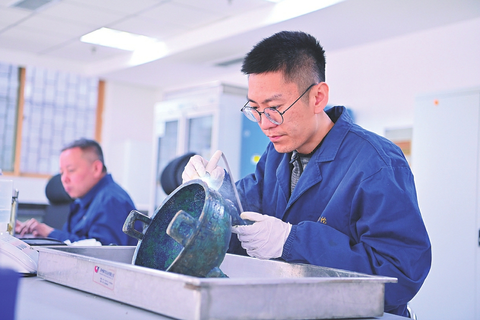 在山西博物院文物保护研究部青铜修复室,张政敏(右)为青铜器进行超声波除锈。新华社记者杨晨光摄