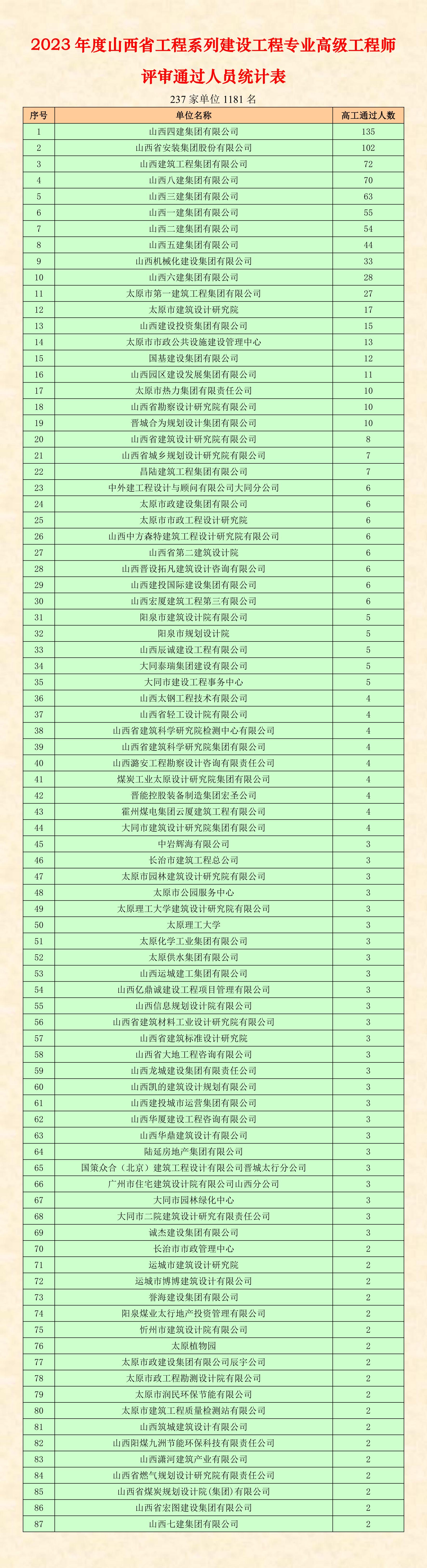 经山西省工程系列建设工程专业高级工程师评审委员会于2023年11月15日评审,通过了王向利等1181名同志具备高级工程师任职资格(详见附件),现予以公示。