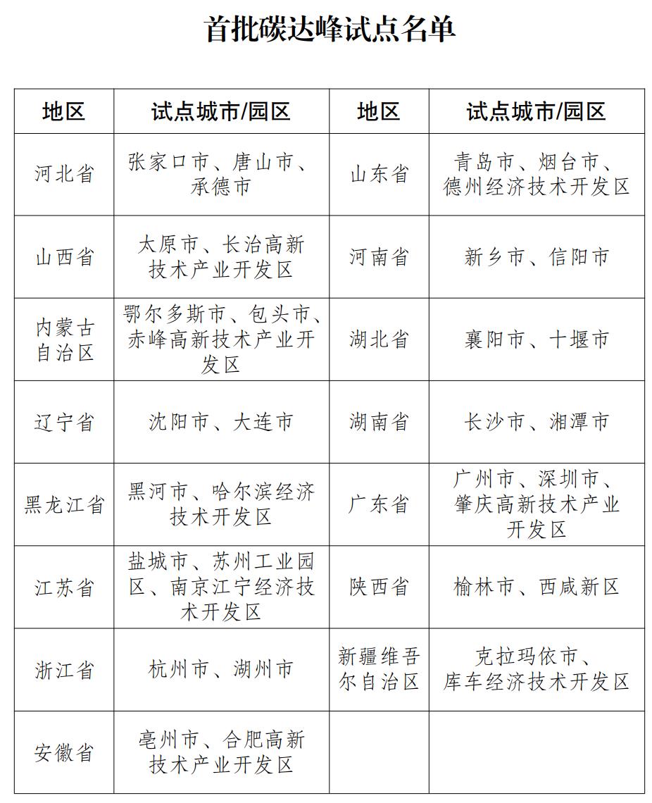 为落实国务院《2030年前碳达峰行动方案》(国发〔2021〕23号)有关部署,按照《国家碳达峰试点建设方案》(发改环资〔2023〕1409号)工作安排,经有关地区城市和园区自愿申报、省级发展改革委推荐、省级人民政府审核、国家发展改革委复核,确定张家口市等25个城市、长治高新技术产业开发区等10个园区为首批碳达峰试点城市和园区,现予公布,并就有关事项通知如下: