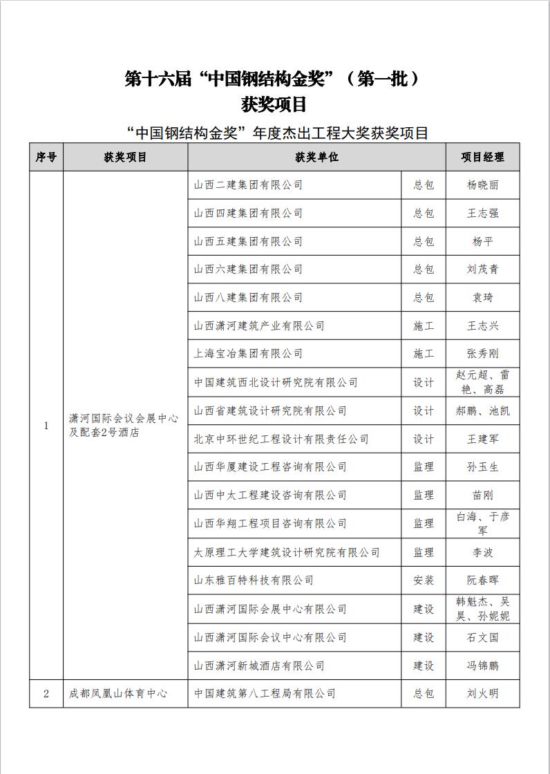 本报讯 近日,中国建筑金属结构协会公布了第十六届“中国钢结构金奖”(第一批)和“中国钢结构金奖年度杰出工程大奖”获奖项目名单,由山西建投潇河公司参建的山西·潇河新城“潇河国际会议会展中心及配套2号酒店项目”经过层层选拔,斩获“中国钢结构金奖年度杰出工程大奖”。
