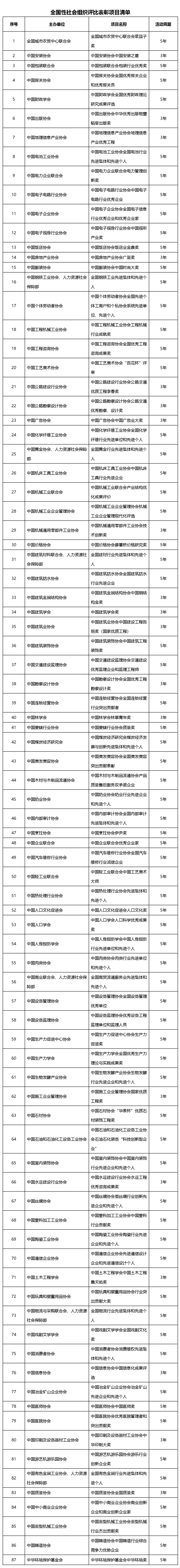 按照党中央、国务院关于清理优化创建示范和评比表彰活动相关工作要求,依据社会组织评比表彰活动管理有关规定,经履行相关工作程序,现公布全国性社会组织评比表彰项目清单。
