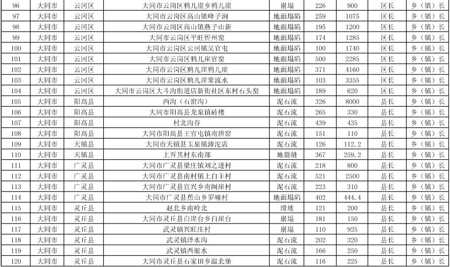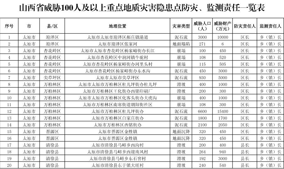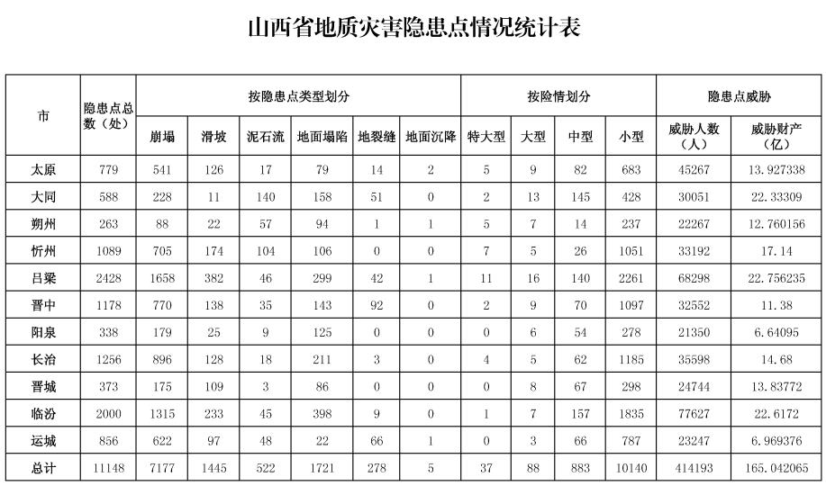 本报太原6月2日讯(记者王佳丽)省自然资源厅6月1日印发的《山西省2023年度地质灾害防治方案》(以下简称《方案》),划定了晋西黄土高原、太原西山—汾西—霍州—乡宁—河津矿区、太原东山—阳泉—潞安—晋城—沁水矿区、岚县—静乐矿区共4个崩塌、滑坡地质灾害重点防治区。