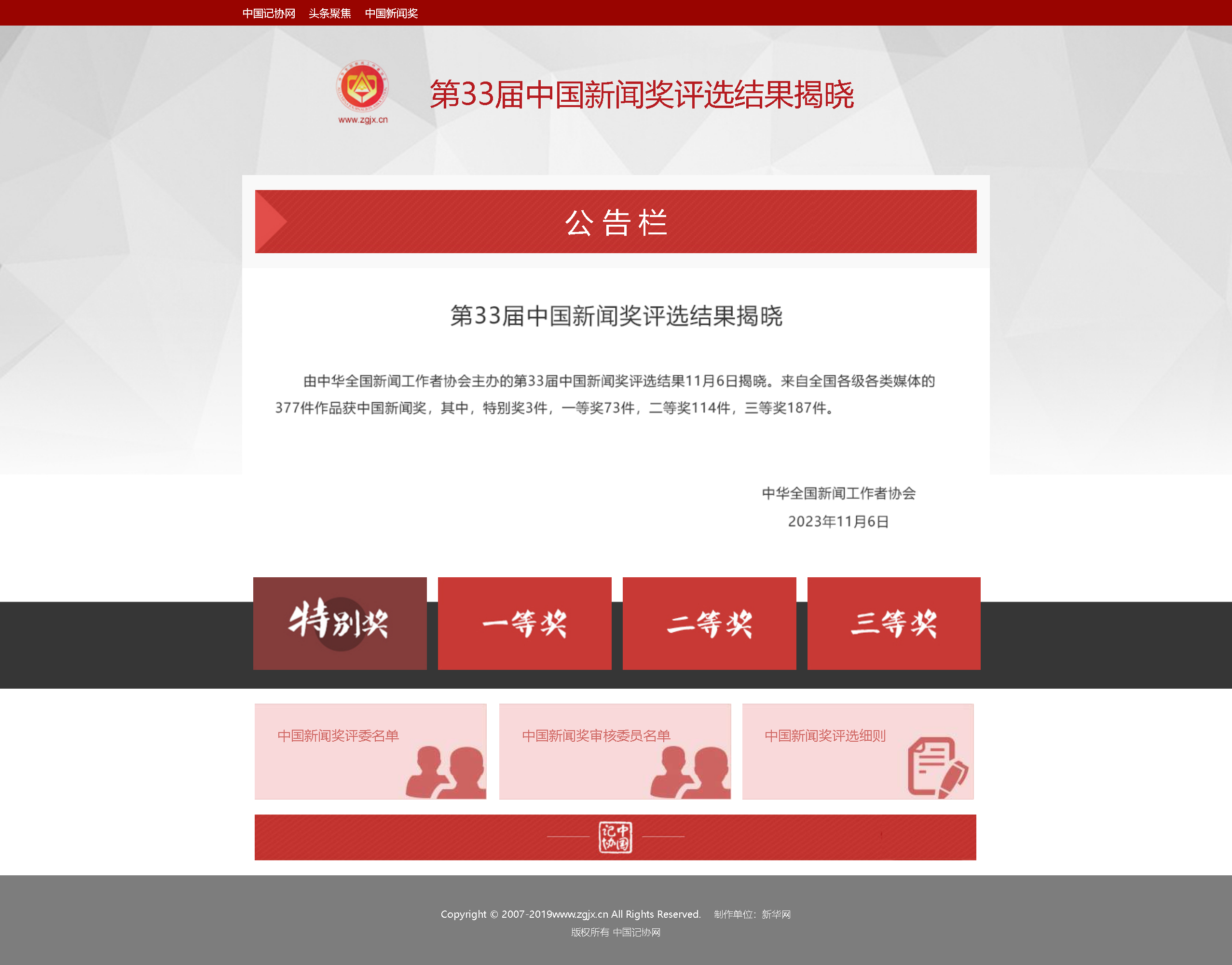 新华社北京11月6日电 由中华全国新闻工作者协会主办的第33届中国新闻奖评选结果11月6日揭晓。来自全国各级各类媒体的377件作品获中国新闻奖,其中,特别奖3件,一等奖73件,二等奖114件,三等奖187件。