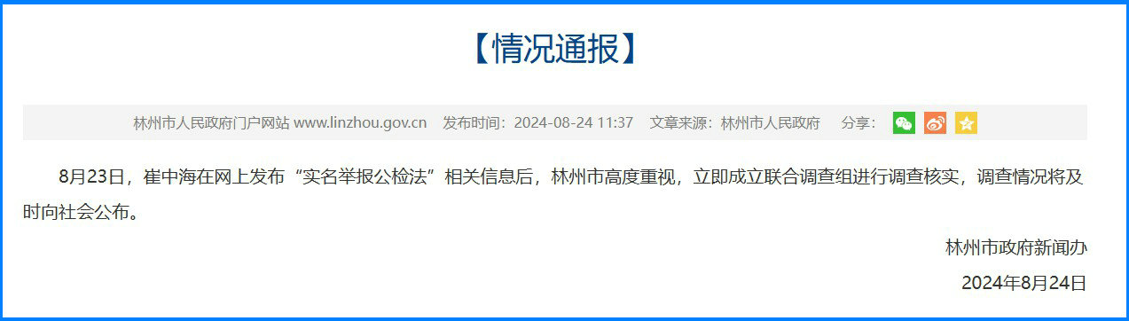 针对上述举报,林州市政府新闻办24日发布情况通报,称8月23日,崔中海在网上发布“实名举报公检法”相关信息后,林州市高度重视,立即成立联合调查组进行调查核实,调查情况将及时向社会公布。