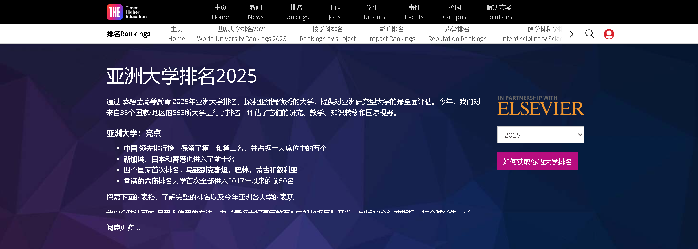 英国泰晤士高等教育2025年亚洲大学排名,共有来自35个国家或地区的853所大学上榜,评审指标包括“产业”“国际展望”“研究质量”“研究环境”和“教学”等。