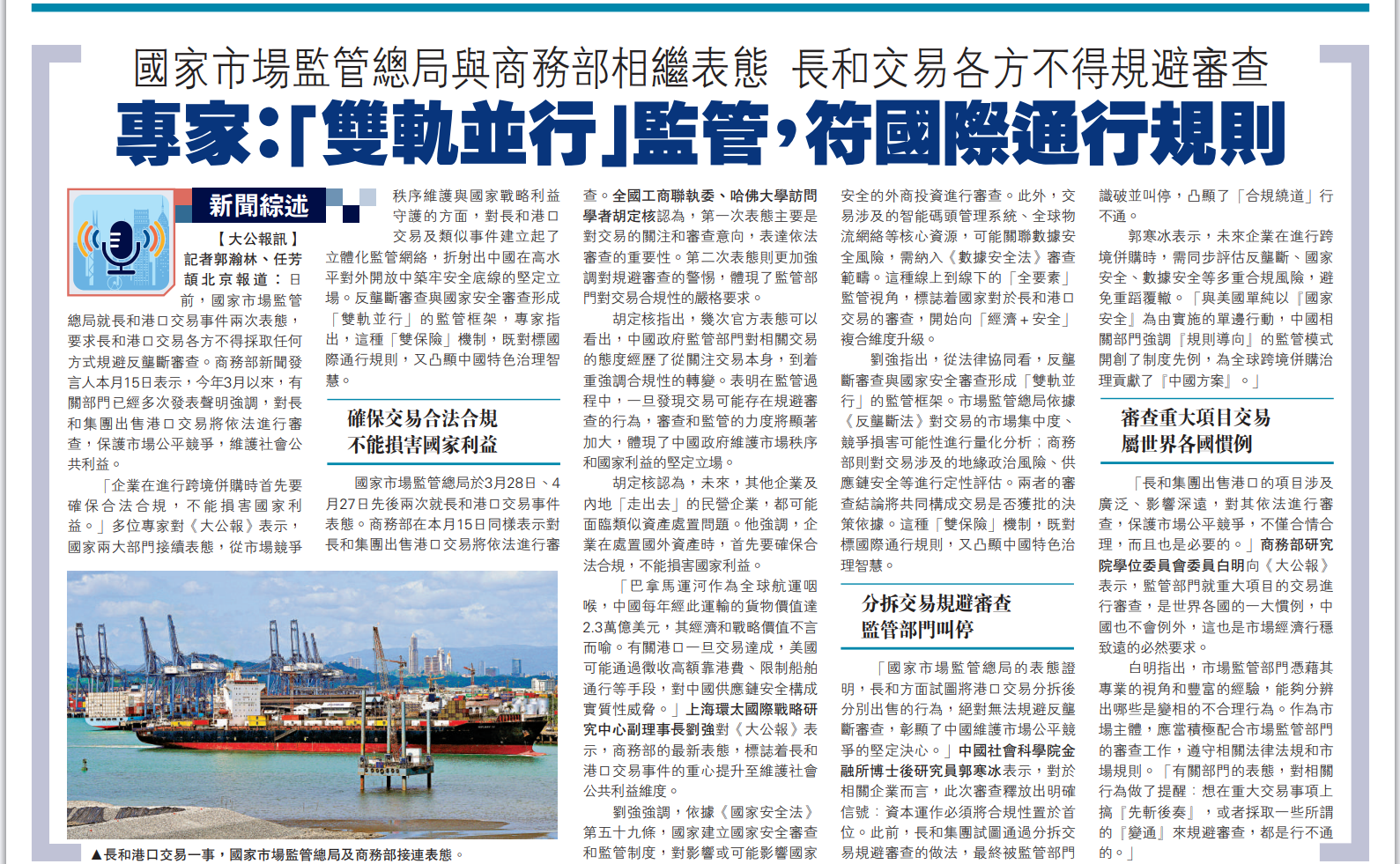 「企业在进行跨境并购时首先要确保合法合规,不能损害国家利益。」多位专家对《大公报》表示,国家两大部门接续表态,从市场竞争秩序维护与国家战略利益守护的方面,对长和港口交易及类似事件建立起了立体化监管网络,折射出中国在高水平对外开放中筑牢安全底线的坚定立场。反垄断审查与国家安全审查形成「双轨并行」的监管框架,专家指出,这种「双保险」机制,既对标国际通行规则,又凸显中国特色治理智慧。