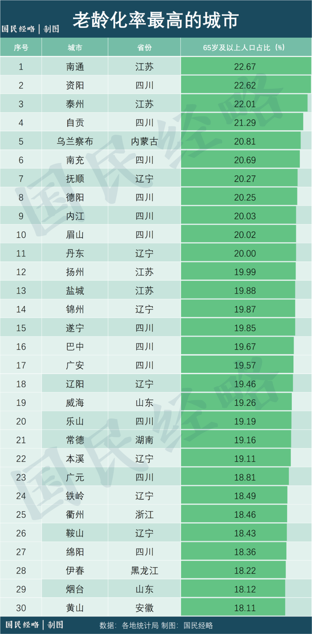 根据七普,2020年,江苏南通老龄化率高达22.67%,超过东北所有地市,位居全国第一。