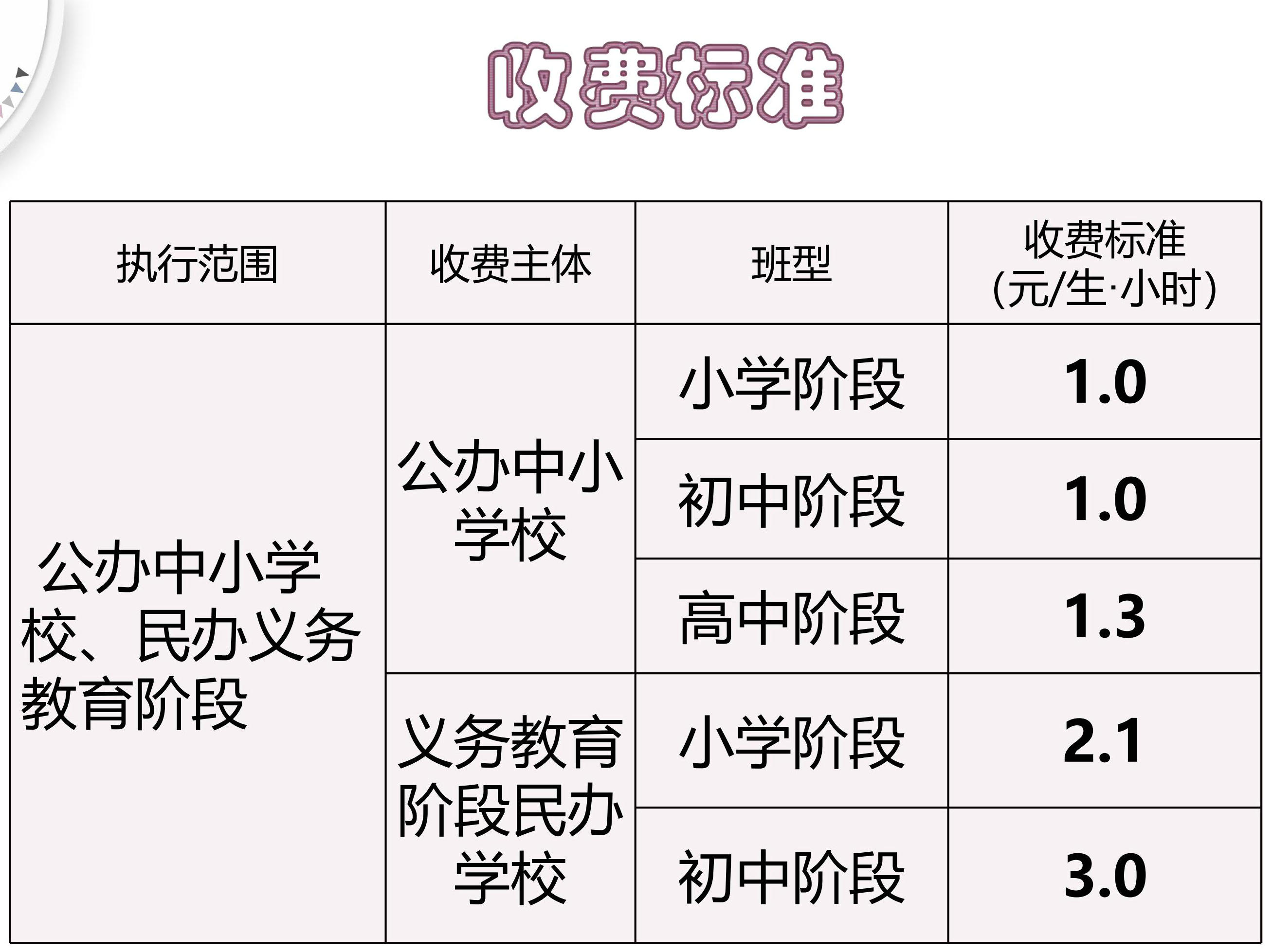 中小学生课后服务收费属于服务性收费,按学期由学校向学生收取。收费时应使用税务机关监制的税务发票。学校要严格执行收费公示制度,将课后服务收费标准、服务时间、课程内容等相关信息公开,主动接受学生、家长和社会监督。