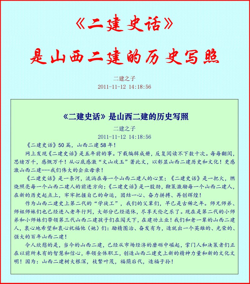 对山西三利装饰集团有限公司印象深刻,是2011年我撰写《二建史话》是山西二建的历史写照一文,被三利集团网站收入《美文欣赏》栏目之中。