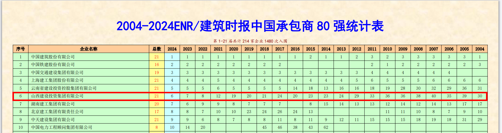 上周我在一篇文章中说到今年《建筑时报》ENR中国承包商80强该发榜了,今天如约而至,山西建投排名第六,孩子们干的不错嘛!