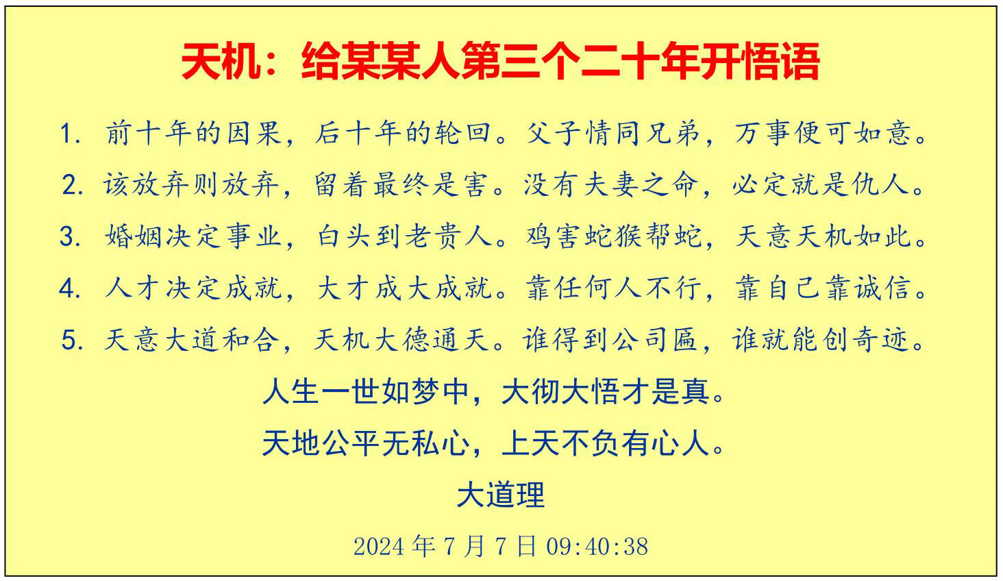 下面两篇文章,是去年七月七日给决定未来两个人的人生命运测试题,现在可以公开结果:拿到赋予“悟之”之人,失去了未来二十年的机遇,遗憾!拿到赋予“用之”之人,获得了未来二十年的天机,祝贺!