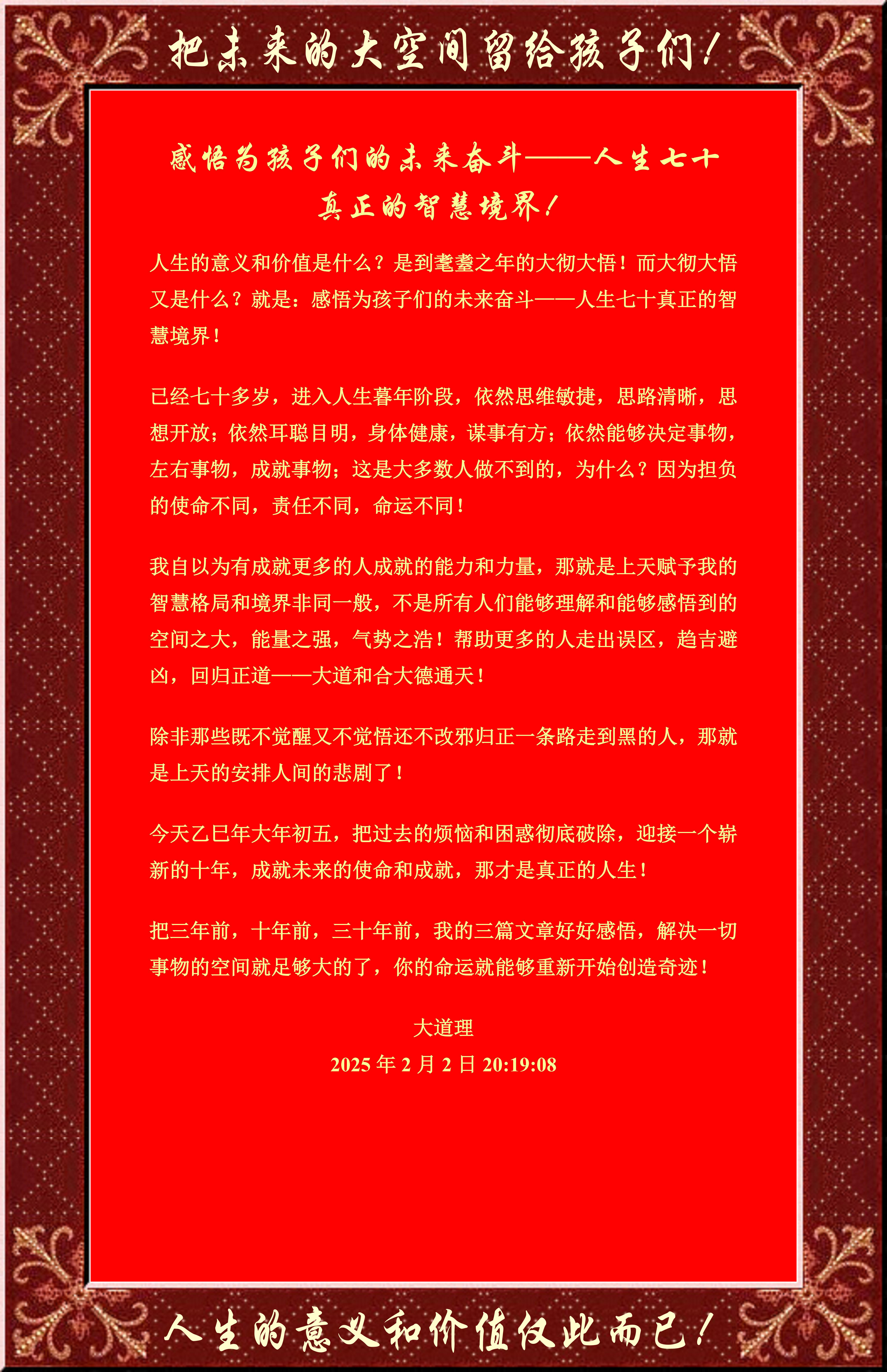 人生的意义和价值是什么?是到耄耋之年的大彻大悟!而大彻大悟又是什么?就是:感悟为孩子们的未来奋斗——人生七十真正的智慧境界!