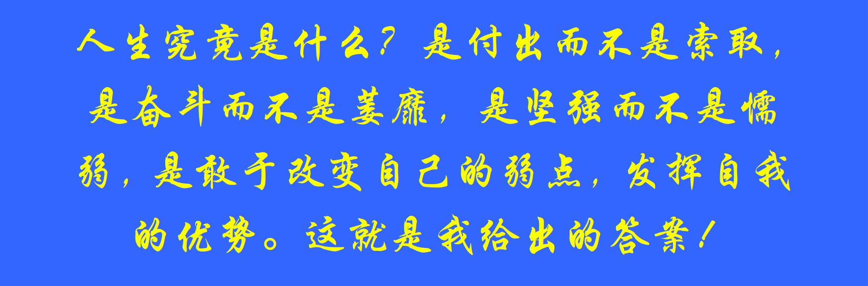 现在是2023年3月2日01:08:11,我在思考人生究竟是什么?是付出而不是索取,是奋斗而不是萎靡,是坚强而不是懦弱,是敢于改变自己的弱点,发挥自我的优势。这就是我给出的答案!