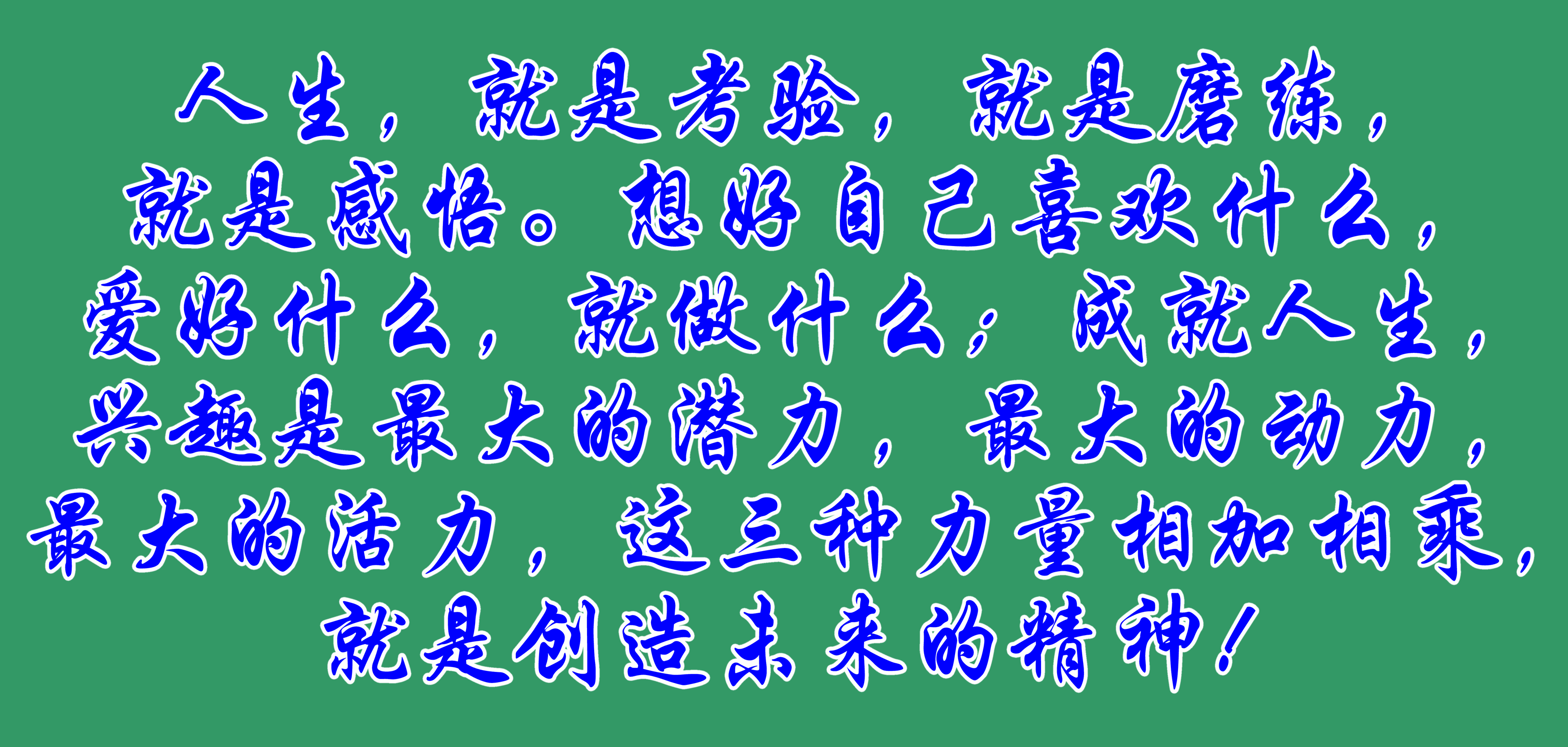 人生,就是考验,就是磨练,就是感悟。想好自己喜欢什么,爱好什么,就做什么;成就人生,兴趣是最大的潜力,最大的动力,最大的活力,这三种力量相加相乘,就是创造未来的精神!