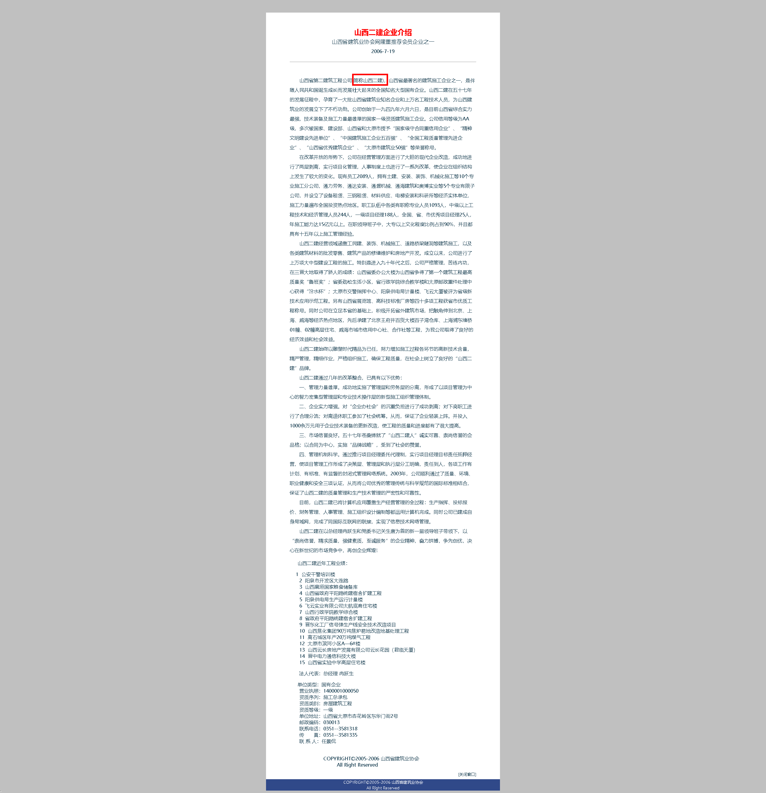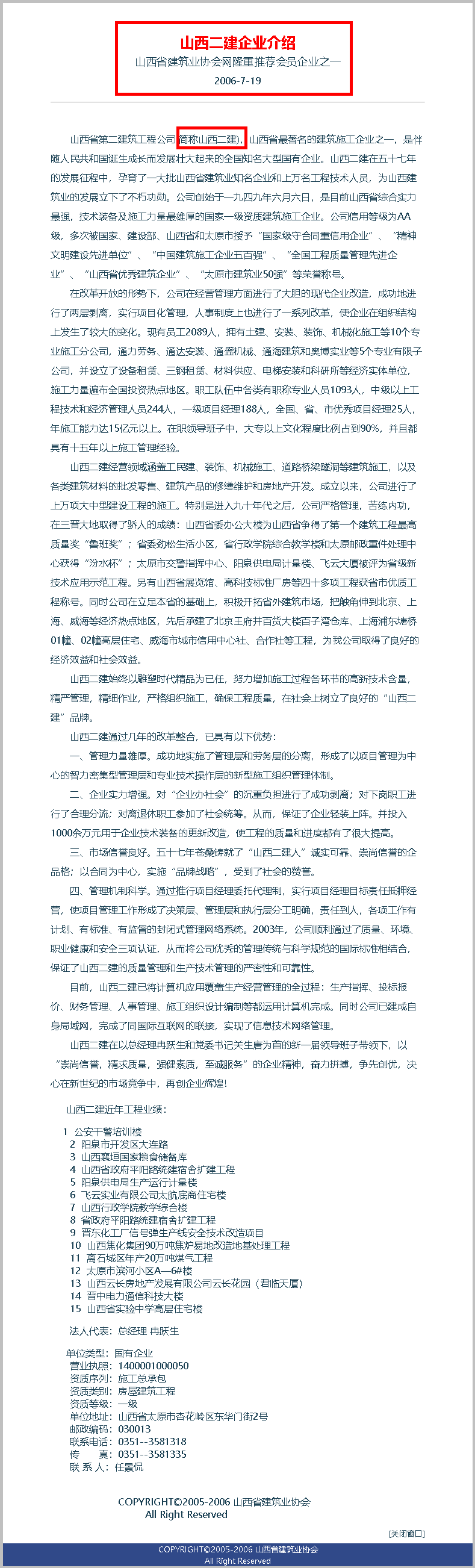 你看看我是如何推荐我的母企的,是协会作为宣传会员企业的第一家,尤其是我划了红框的“山西二建”,更是历史上第一次这么称呼,十年后2016年1月5日的山西二建集团有限公司揭牌仪式,正是那时候就开始谋划的!