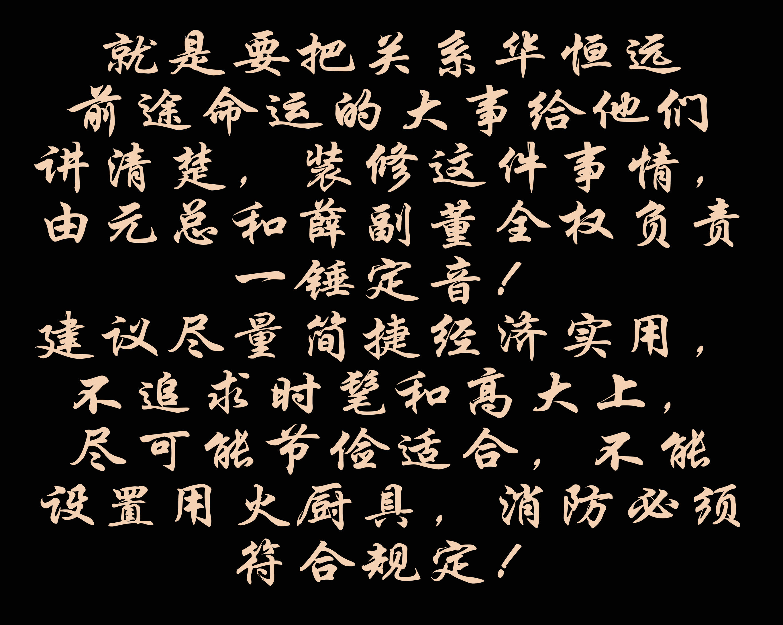 我下午约见董事长夫妇一晤,就是要把关系今年会前途命运的大事给他们讲清楚,装修这件事情,由元总和薛副董全权负责一锤定音!