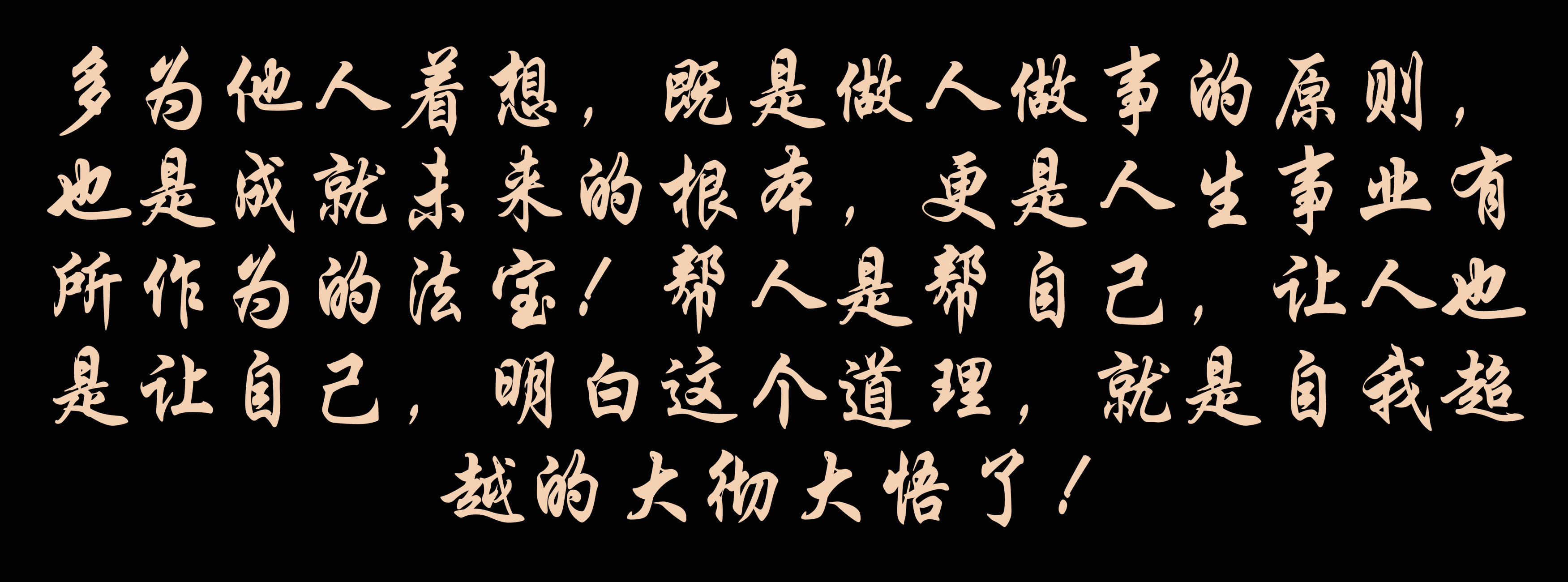 多为他人着想,既是做人做事的原则,也是成就未来的根本,更是人生事业有所作为的法宝!帮人是帮自己,让人也是让自己,明白这个道理,就是自我超越的大彻大悟了!