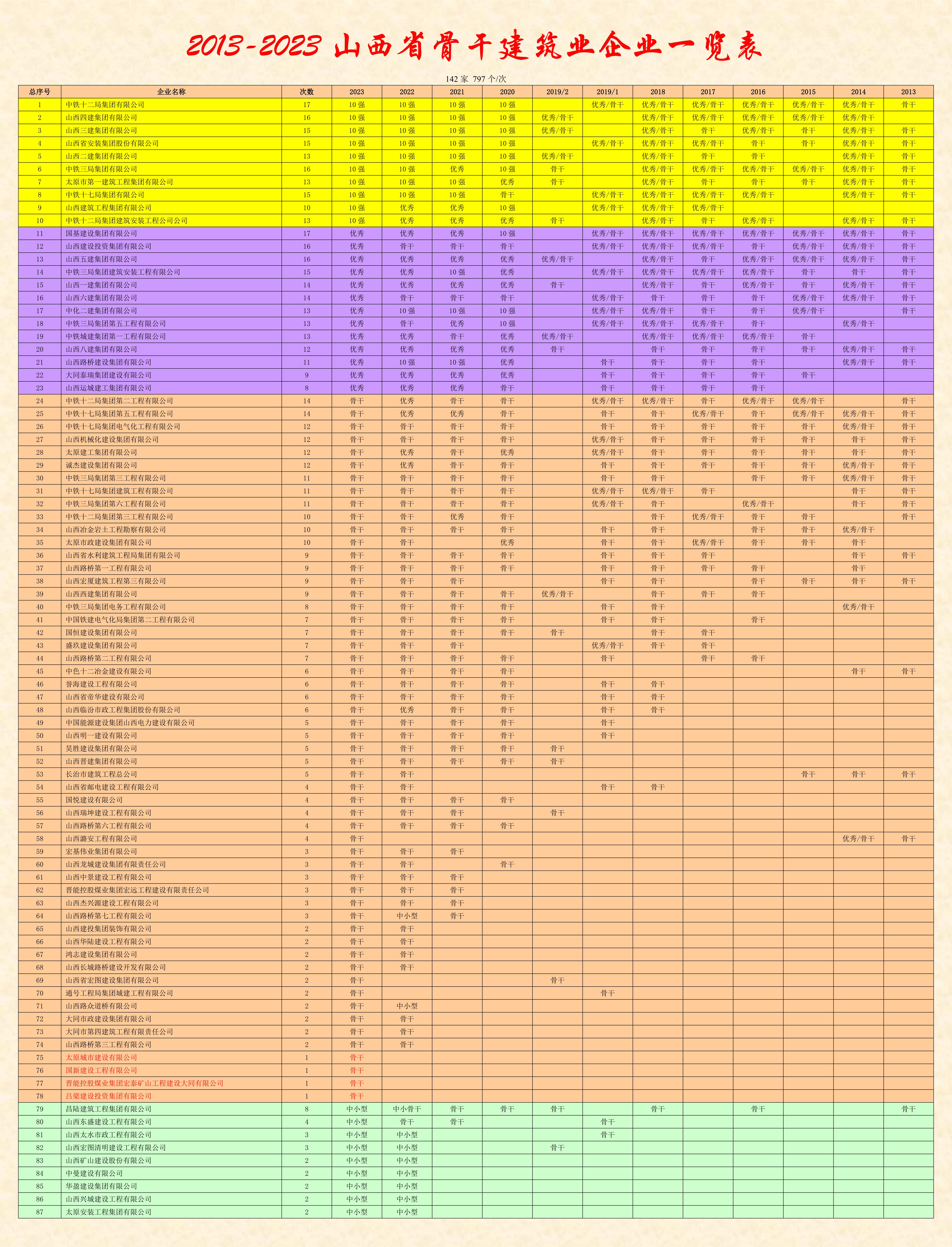 今天,省住建厅公布了2023年度山西省骨干建筑业企业名单。这是从2013年开始连续十一年第12次对全省建筑业企业的又一次检验和认定!