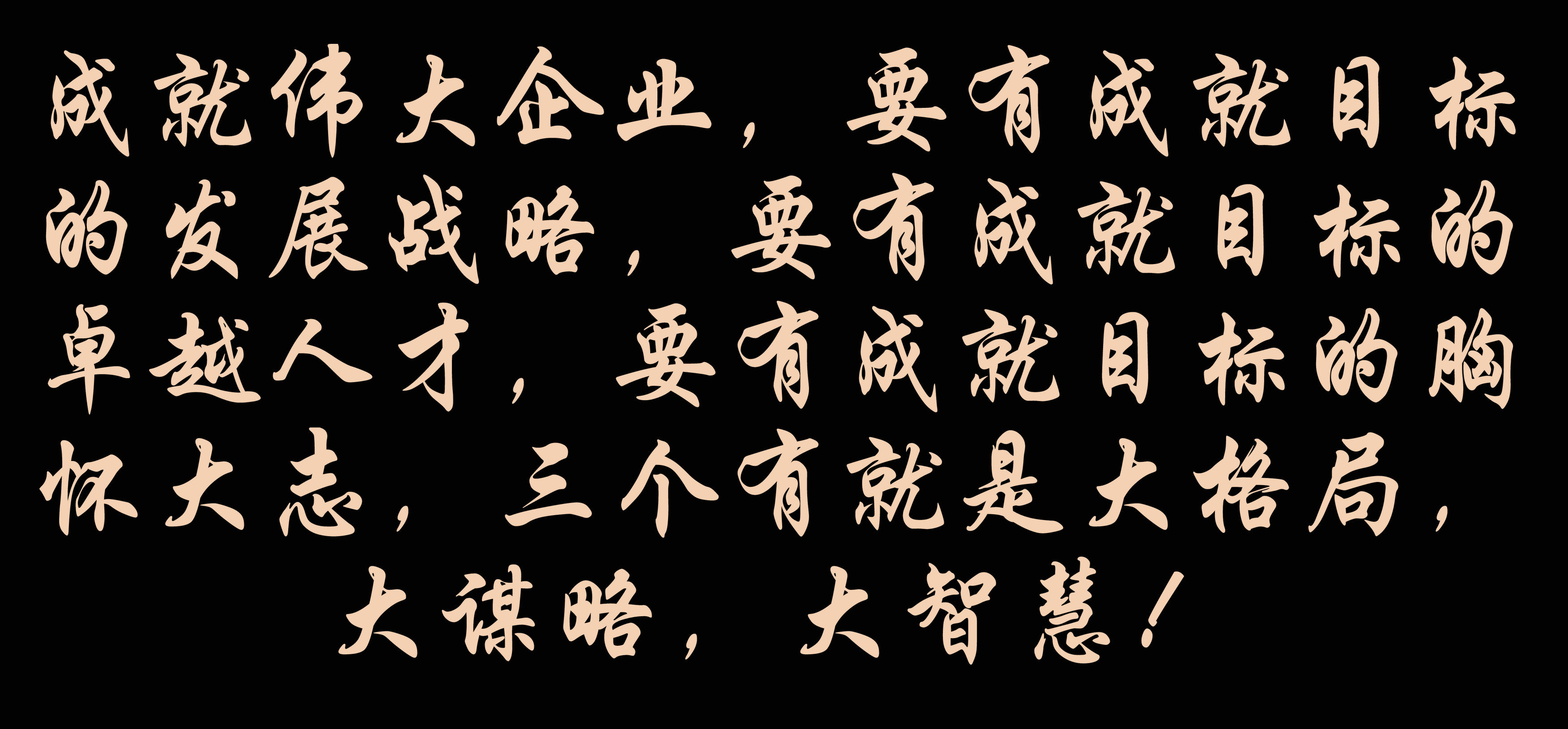 成就伟大企业,要有成就目标的发展战略,要有成就目标的卓越人才,要有成就目标的胸怀大志!三个“要有”就是大格局,大谋略,大智慧!