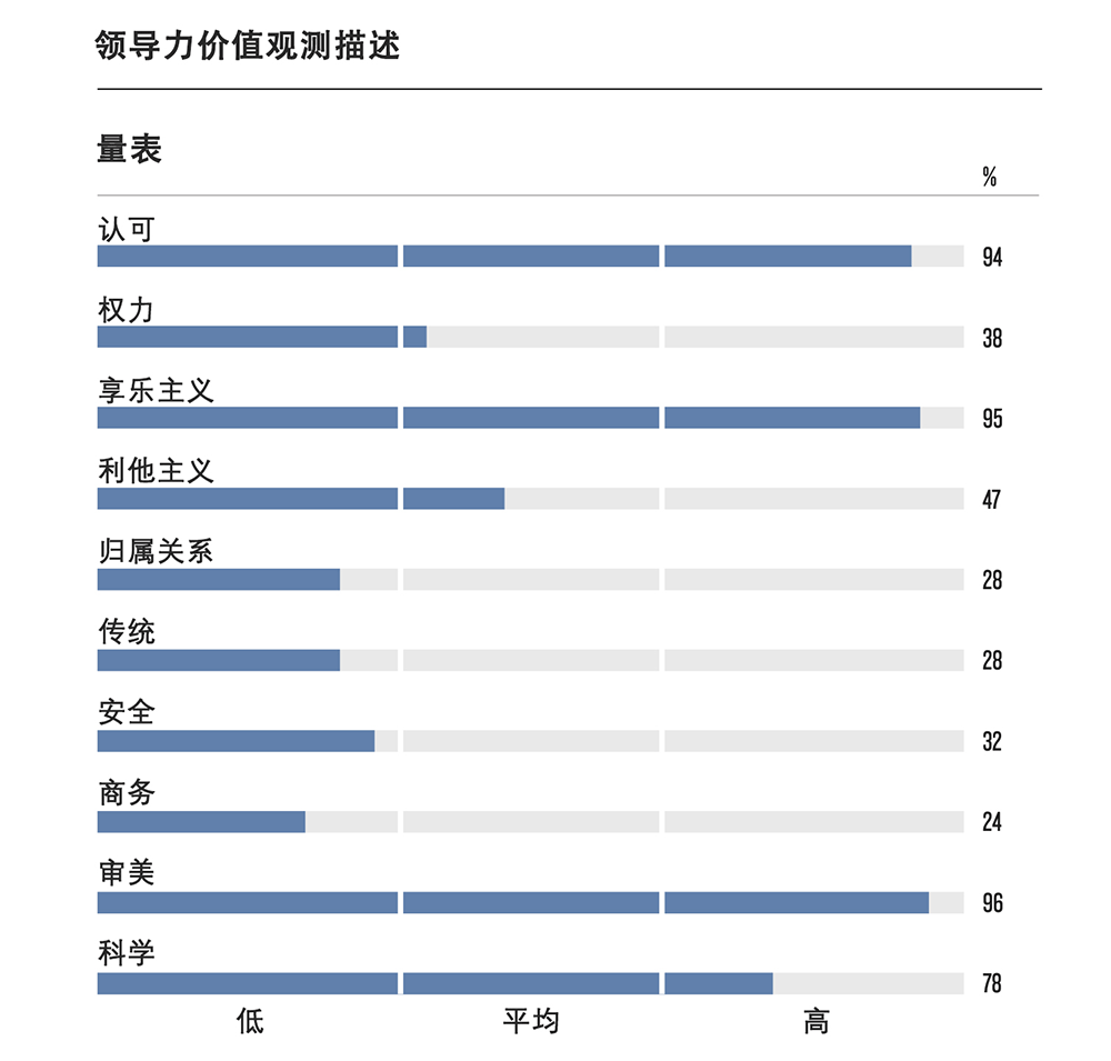 三项评估里的第一项,即人格量表,被霍根称为“光明面测评”。人格量表测评的是你处于最佳状态时的表现——整夜安眠,没有压力,精力充沛。第二项是发展量表,另外一种说法是“阴暗面量表”。发展量表测评的是你处于最糟糕状态时的表现。最后一项是动机、价值观和偏好量表,旨在了解你的动力和目标。