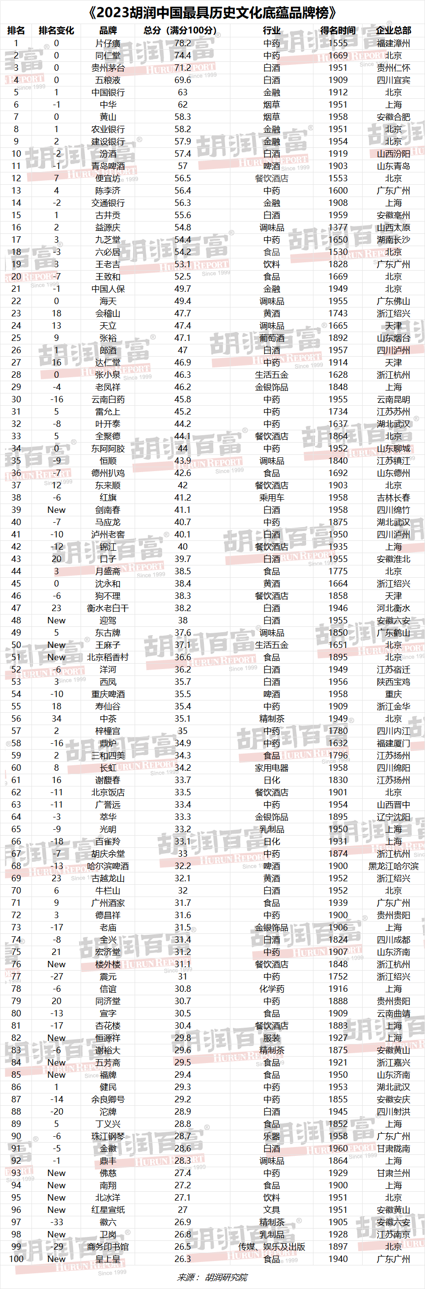 胡润研究院发布《2023胡润中国最具历史文化底蕴品牌榜》