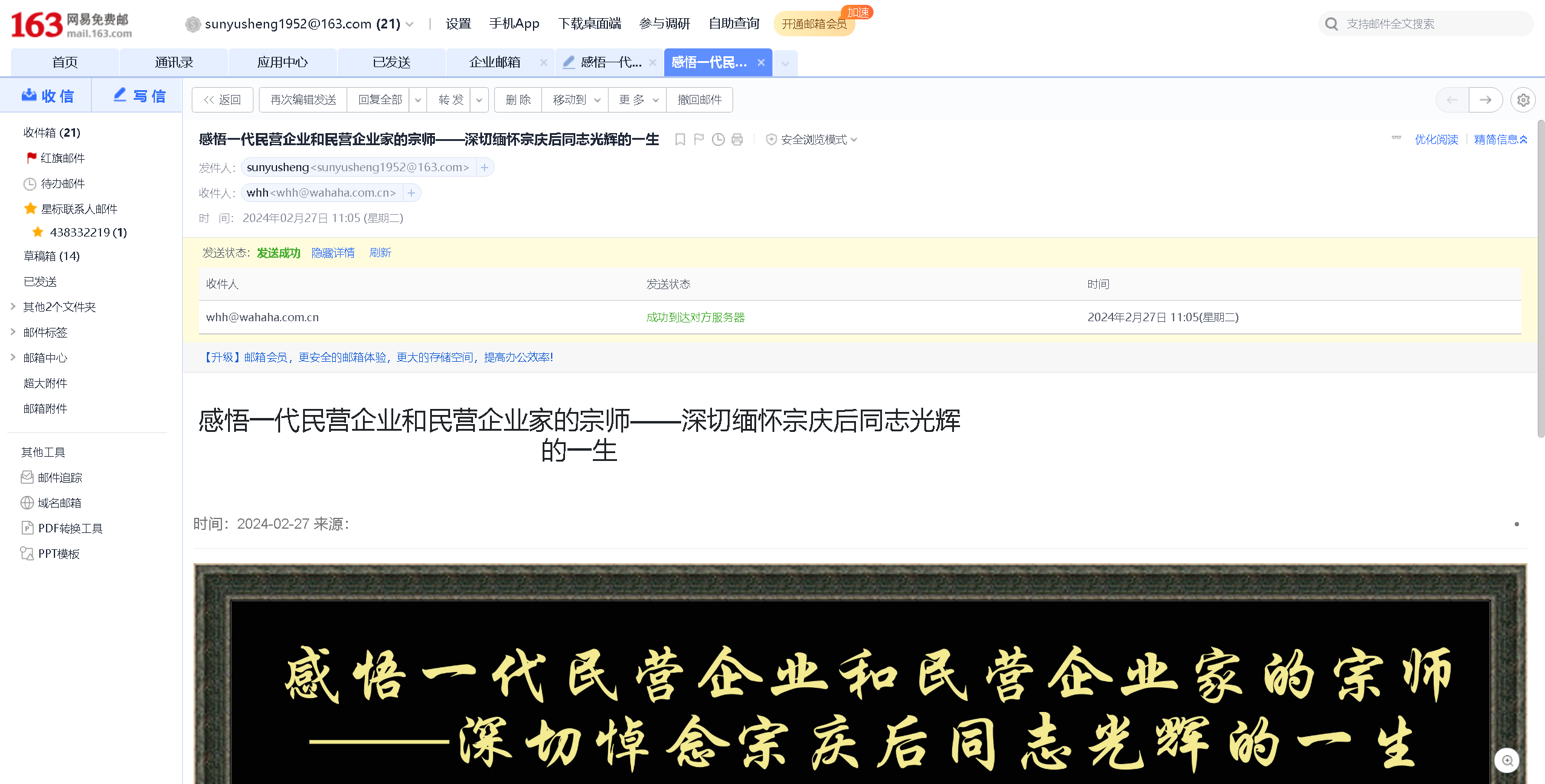 中国民营企业和民营企业家一代宗师的杰出代表,娃哈哈集团创始人宗庆后同志,2月25日因病医治无效,永远离开了他为之拼搏奋斗的事业和所有爱戴他的人们!