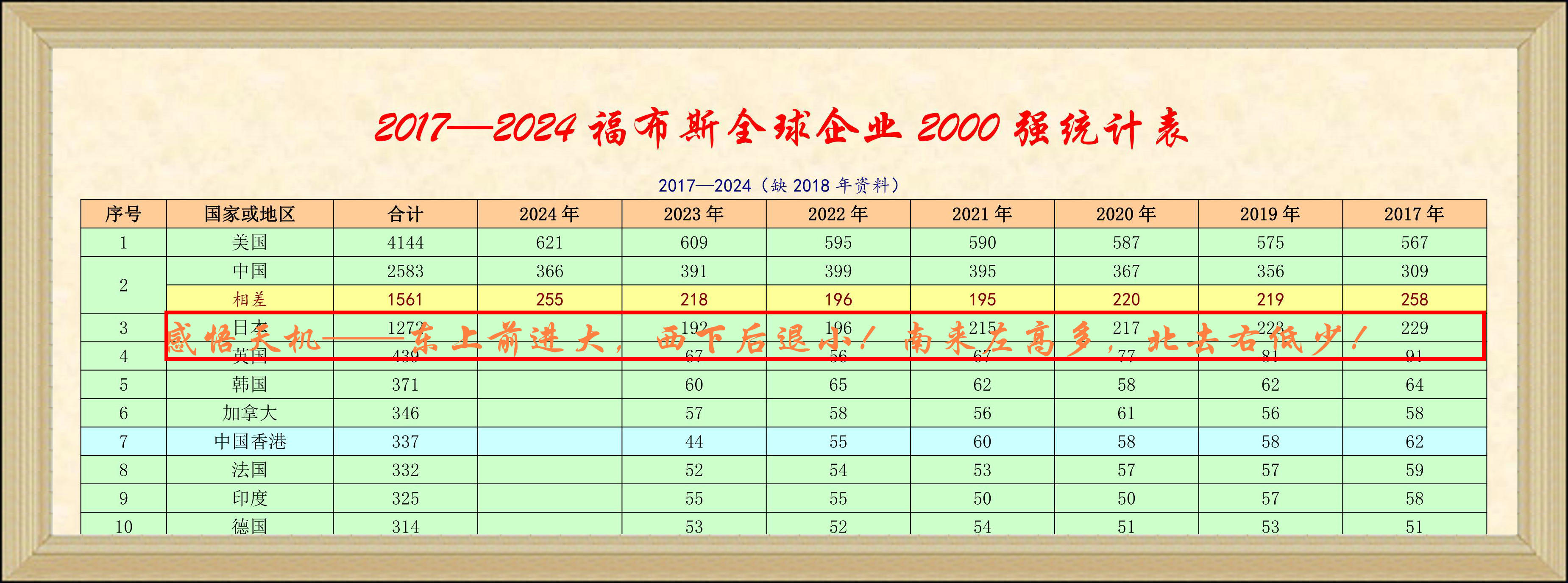 今年福布斯全球2000强榜单,中美以621比366分别拿下世界大公司总数第一第二名,差距还是比较大的!